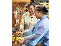 「糸を布にする」はた織体験。本格的な織り機で職人が丁寧に指導します。自分で織った、特別な旅行記念としてコースターが人気。藍、福木・・・